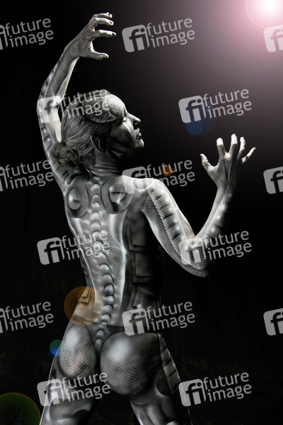 Bodypainting, Erotik, Frau, nackt, drinnen, weiblich, Monster, Außerirdische, Alien, Echse, Körperkunst, Kunst, Malerei, monochrom, erotic, woman, nude, indoor, female, monochrome, lizard, body art, body painting