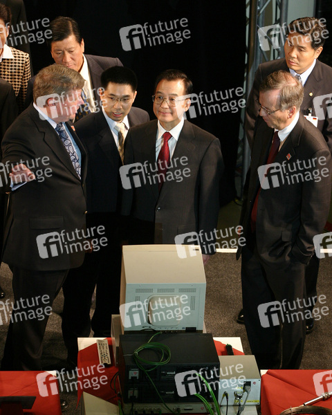 Wen Jiabao, Ministerpräsident der Volksrepublik China (mi.) und Wolf-Dietrich Krüger, Generalmanager des Gasturbinenwerks und Leiter der weltweiten Gasturbinenfertigung der Siemens AG (li.), und Heinrich v. Pierer, Vorstandsvorsitzender der Siemens AG (re