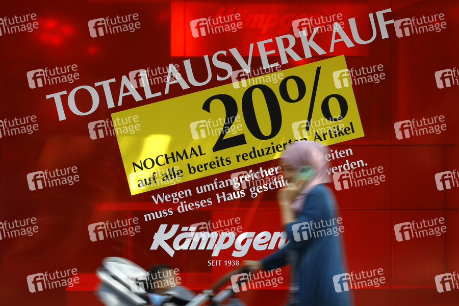 Der Hinweis 'Totalausverkauf' an einem Schuhgeschäft in der Kölner Innenstadt. Der Einzelhandel hat im Zuge der Corona-Maßnahmen hohe Umsatzeinbußen hinnehmen müssen und hofft nun auf weitere Lockerungen. (Themenbild, Symbolbild) Köln, 11.06.2021