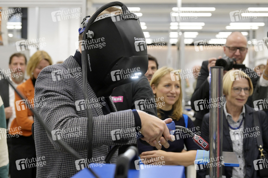 Christian Lindner beim Lehrgang virtuelles Schweißen mit Schweißermaske während des Rundgangs im ABB-Ausbildungszentrum Berlin-Pankow. Berlin, 16.09.2024