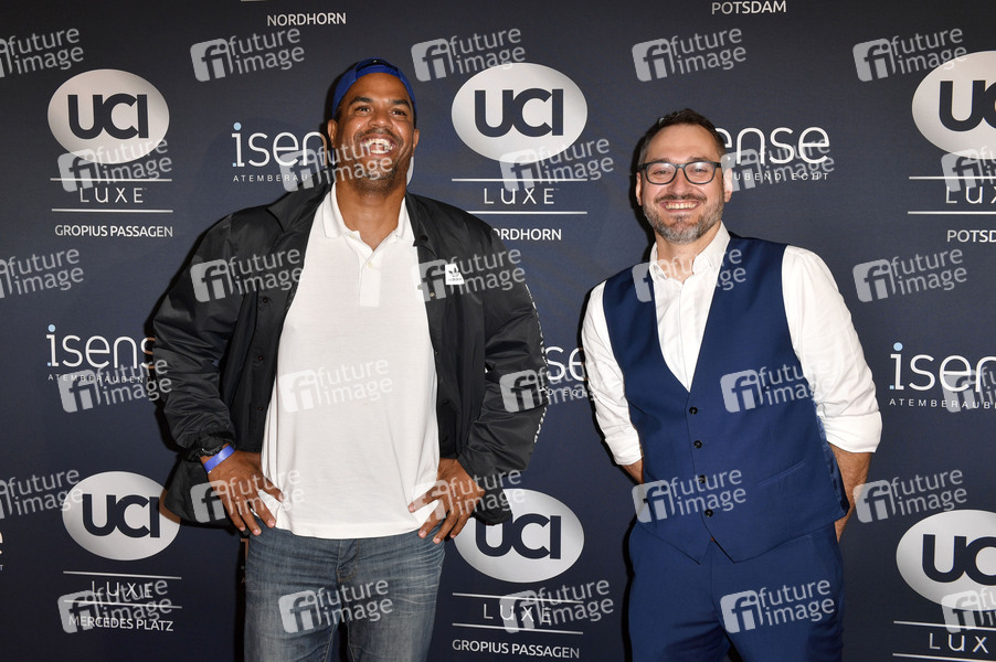 Patrice Bouedibela und Bernhard Weik beim Photocall anlässlich der Wiedereröffnung des UCI Luxe Kino Mercedes Platz mit einem Special-IMAX-Screening des Kinofilms 'Tenet' im Kino UCI Luxe Mercedes Platz. Berlin, 26.08.2020