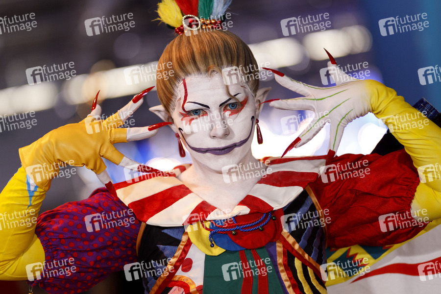 Rollenspiel, Kostüm, Harlekin, Hofnarr, Schalk, Narr, Barde, Clown, Faxenmacher, Schelm, Player, Bildschirmlicht, Spielesucht, Digitalisierung, Reizüberflutung, Spiele-Messe, Gaming, Gaming-Industrie, Spieleindustrie, Spielemesse, Gamingindustrie, Zocken, Daddeln, Games, Game, Spiele, PC-Spiele, Computerspiele, Konsolen, Konsolenspiele, Videospiele, Fair, Event, Gamer, Unterhaltungselektronik, Software, Hardware, europäische Leitmesse für digitale Spielekultur, internationale Gaming-Community, Gamescom Congress 2019, Virtual Reality, Browsergames, Spieletrends, Symbolfoto, Symbolbild