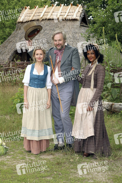 Stefanie Stappenbeck, Stephan Grossmann und Dennenesch Zoude beim Pressefototermin am Set des Märchenfilms 'Das Märchen vom goldenen Taler' für die ARD-Märchenreihe 'Sechs auf einen Streich' im Museumsdorf Düppel. Berlin, 08.07.2020