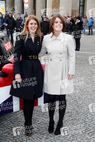 Die Prinzessinnen Beatrice und Eugenie mit einem Mini Cooper unterwegs auf einer Werbetour für ihre britische Heimat am Brandenburger Tor, Berlin