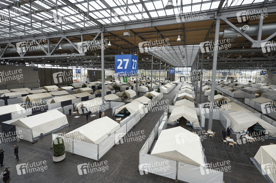 Zeltdörfer-Unterkünfte für ukrainische Kriegsflüchtlinge in der Halle 27 auf dem Messegelände, inklusive Wasch- und Duschmöglichkeiten, errichtet von der Feuerwehr Hannover. Die spätere Versorgung erfolgt durch das DRK. Hannover, 06.03.2022