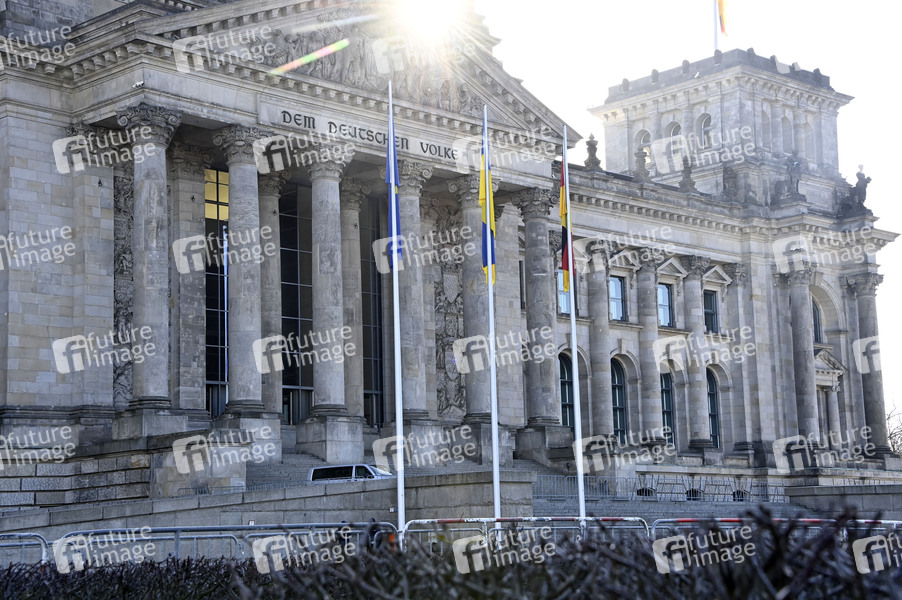 Solidarität, Ukraine, Russland, Ukrainekonflikt, Bundestag, Politik, Reichstag, Deutscher Bundestag, Krieg, Krise, Krisen, Parlamentsgebäude, Flagge, Flaggen, Fahne, Fahnenmast, Beflaggung, Flaggensetzung, Flaggenhissung, Fahnen