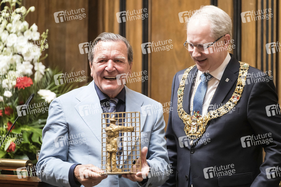 Gerhard Schröder und Stefan Schostok mit Bronzeplastik der Landeshauptstadt Hannover 'Ich will da rein' beim Empfang zum 75. Geburtstag von Ehrenbürger und Bundeskanzler a.D. Gerhard Schröder im Neuen Rathaus. Hannover, 24.04.2019