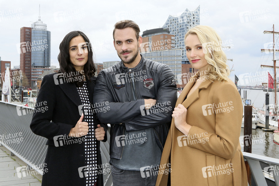 Aybi Era, Marc Barthel und Anna Hofbauer beim Fototermin am Set der ZDF TV-Serie 'Notruf Hafenkante - Die Pokerprinzessin' im City Sporthafen. Hamburg, 11.04.2019.