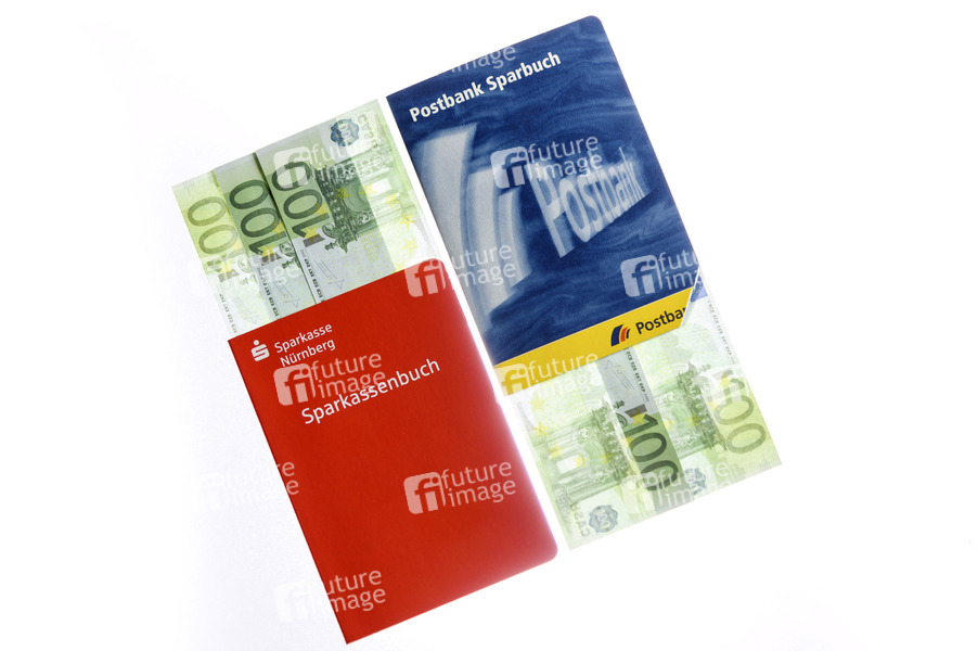 Sparbücher der Postbank und der Sparkasse mit Bargeld