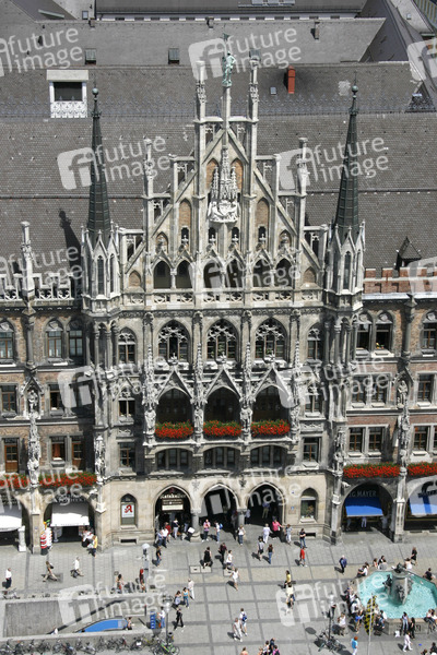 Marienplatz, Sitz des Oberbürgermeisters und der Stadtverwaltung, erbaut 1867 bis 1909 von Georg von Hauberrisser, Neugotik, der 85 m hohe Rathausturm mit dem Münchner Kindl an der Turmspitze enthält das fünftgrößte Glockenspiel Europas, 43 Glocken, 400 Zimmer