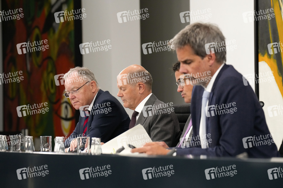 Stephan Weil, Olaf Scholz, Boris Rhein und Steffen Hebestreit bei der Pressekonferenz im Anschluss an die Beratungen der Bundesregierung mit den Regierungschefinnen und Regierungschefs der Länder im Bundeskanzleramt. Berlin, 20.06.2024