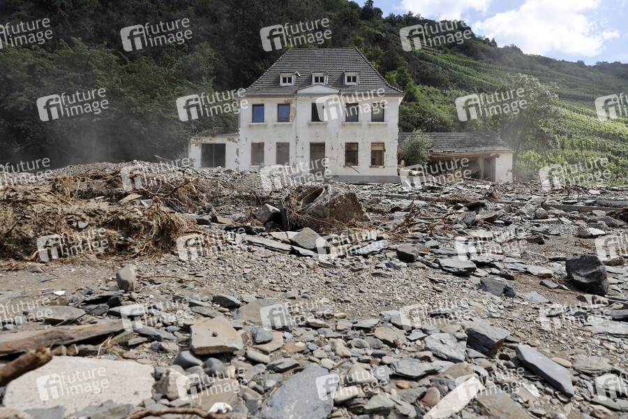 Nach dem Jahrhunderthochwasser in der Eifel durch heftige Regenfälle und Dauerregen mit Überschwemmungen und Überflutungen haben die Aufräumarbeiten im Ahrtal große Fortschritte gemacht. Einheiten von Polizei, THW, Bundeswehr und Feuerwehr mitsamt vielen freiwilligen Helfern haben Straßen geräumt, Schutt und Schlamm entfernt und die Menschen versorgt. Der Wiederaufbau wird trotzdem Jahre dauern. Im Bild Flutschäden bei der Ortschaft Mayschoß, in der die Flut viele Häuser zerstörte, 30.07.2021