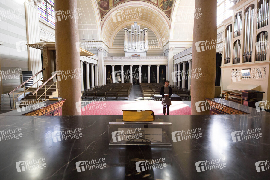 Die Pfarrerin Aline Seel und der Pfarrer Matthias Miele begehen den Karfreitag Gottesdienst in der menschenleeren St. Nikolaikirche. Um 15:00 Uhr ertönten die Glocken der Kirche. Potsdam, 10.04.2020