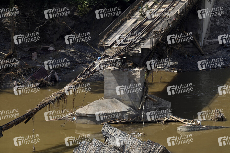 Nach dem Jahrhunderthochwasser in der Eifel durch heftige Regenfälle und Dauerregen mit Überschwemmungen und Überflutungen haben die Aufräumarbeiten im Ahrtal begonnen. Einheiten von Polizei, THW, Bundeswehr und Feuerwehr mitsamt vielen freiwilligen Helfern räumen Straßen, entfernen Schutt und Schlamm und versorgen die Menschen. Im Bild die zerstörte Bahnstrecke und Straße bei der Ortschaft Rech, in der die Flut viele Häuser zerstörte, 22.07.2021