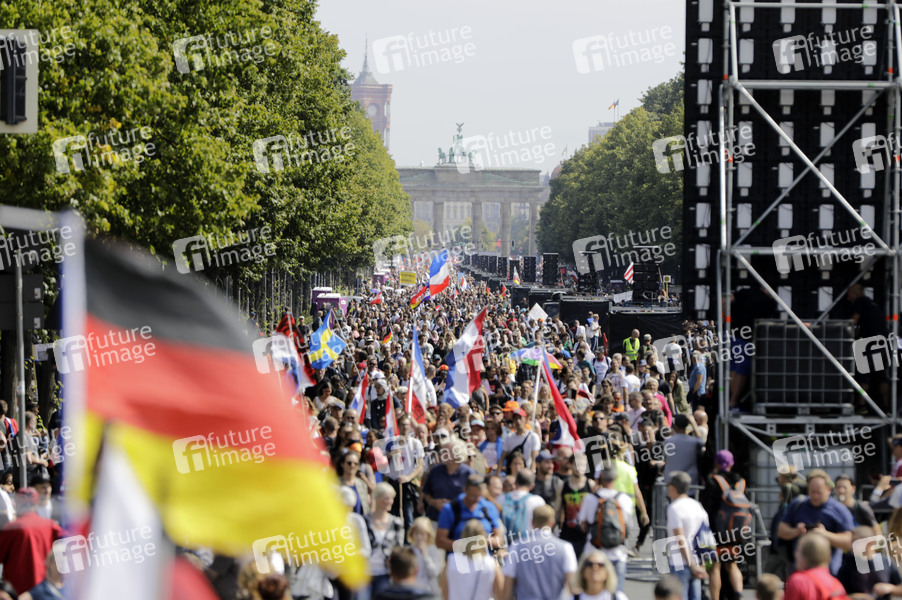 Demonstranten verschiedener Gruppierungen wie etwa der Initiative Querdenken 711 protestierten mit einer Großdemonstration gegen die bestehenden Maßnahmen zur Eindämmung der Corona-Pandemie. Wegen Nichteinhaltung der polizeilichen Auflagen wurde die Demonstration durch die Polizei beendet. Berlin, 29.08.2020