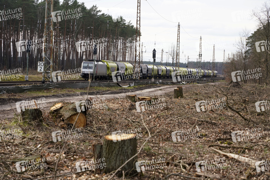 Güterbahnhof Fangschleuse mit abgestelltem Güterzug und Rodung in Vorbereitung der geplanten Erweiterung von Tesla. Die Erweiterungspläne für die Fabrik des Elektroautobauers Tesla in Grünheide (Oder-Spree) bei Berlin sind bei einer Einwohnerbefragung mehrheitlich auf Ablehnung gestoßen. Doch das Votum ist letztlich nicht bindend. Tesla will neben dem 300 Hektar großen Werksgelände einen Güterbahnhof, Lagerhallen und einen Betriebskindergarten errichten. Dafür müssten aber rund 100 Hektar Wald gerodet werden. Das ist umstritten. Es gibt Befürworter der Pläne, aber auch Ablehnung einer Tesla-Erweiterung (Quelle: rbb24). Grünheide, 23.02.2024