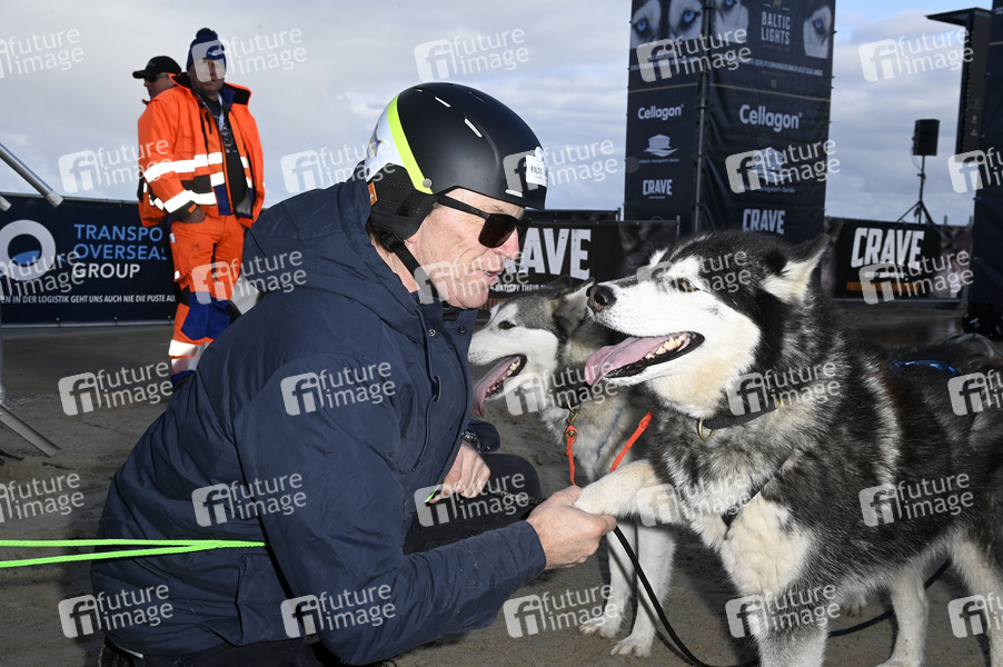 Wolfgang Lippert beim Kennenlernen der Hunde und beim Renntraining für die Baltic Lights 2022 an der Seebrücke Heringsdorf. Heringsdorf, 04.03.2022
