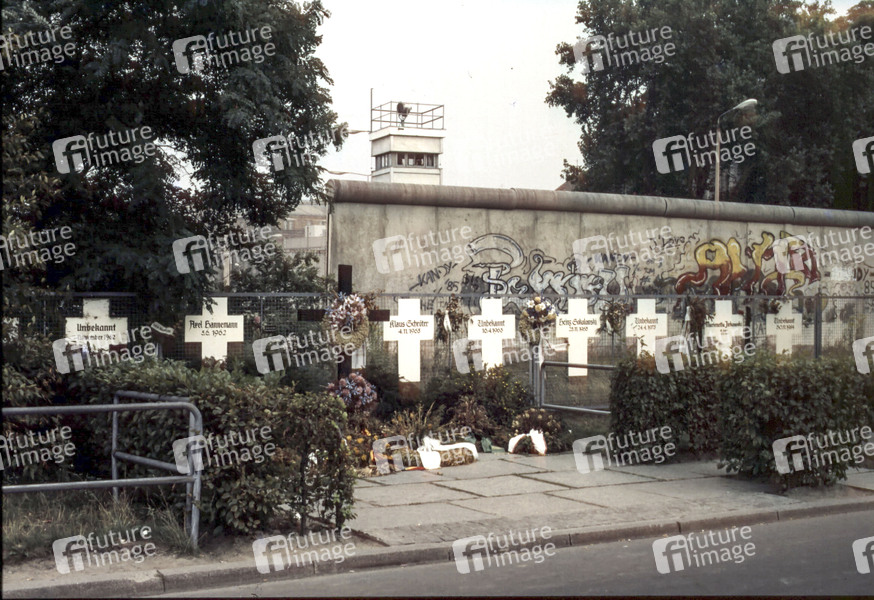 Gedenkkreuze an der Grenzsperranlage an der Staatgrenze zur Deutschen Demokratischen Republik. Berlin, 01.07.1985