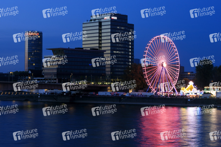 Kirmes, Lichter, Freizeit, Rummel, Volksfest, Unterhaltung, Rummelplatz, Jahrmarkt, Fahrgeschäft, Vergnügen, Looping, Vergnügung, Vergnügungsfahrgeschäft, Vergnügungssteuer, Achterbahn, Rollercoaster, Frühlingsfest, Fahrgeschäft, Fliehkräfte, Fliehkraft, Karussell, Riesenrad, Rheinufer, Chemiekonzern, Energizing Chemistry, Lanxess Tower, Lanxess-Hauptsitz, Fliehkräfte, G-Kräfte, G-Force, Höhenangst, Beschleunigung, Fliehkraft, Lanxess-Zentrale, Symbolbild, Symbolfoto