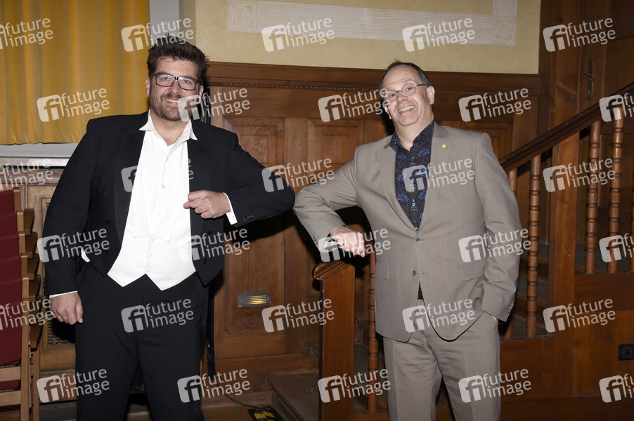 Franz Josef Strohmeier mit Theaterleiter Matthias Riedel-Rüppel nach seinem Soloprogramm 'Der Kontrabass - Monolog für einen Schauspieler' von Patrick Süßkind im Kleinen Theater. Haar, 15.11.2020