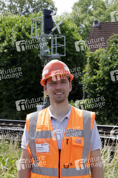 Michael Ries beim Fototermin 'Helikopter fliegt Signalmaste für das neue Elektronische Stellwerk in Bonn-Beuel ein'. Es beginnt letzte große Bauphase vor der Generalsanierung der rechten Rheinstrecke im Jahr 2026. Mit Hilfe eines Helikopters werden knapp 50 Signalmaste für das neue ESTW Bonn-Beuel eingeflogen. Bonn, 14.06.2025