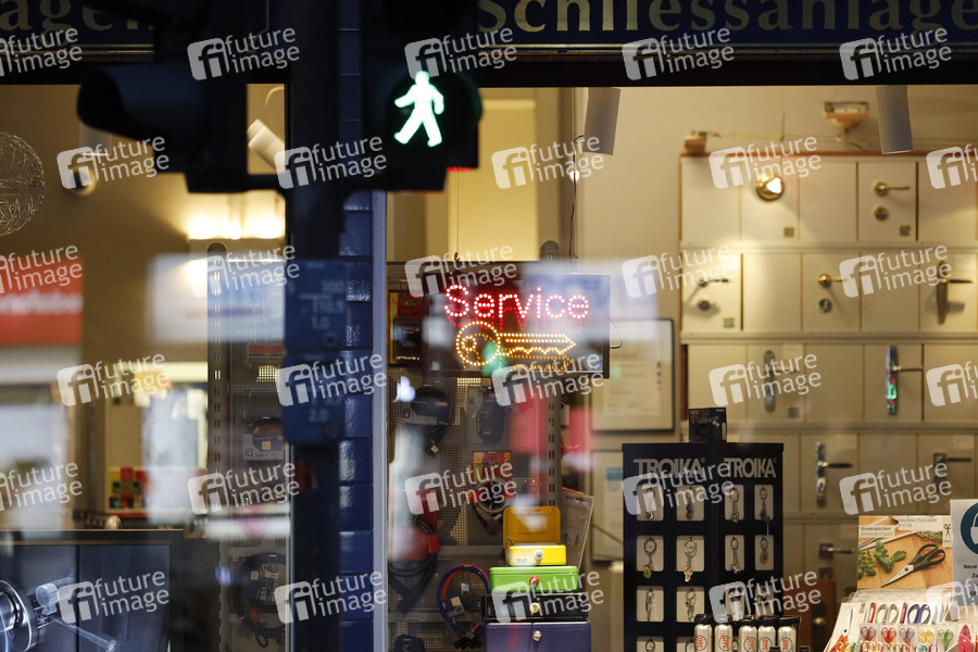 Eine Leuchtreklame für Schlüsseldienst Service an einem Fachgeschäft für Schlösser, Türen und Türschlösser. (Themenbild, Symbolbild) Köln, 12.04.2021