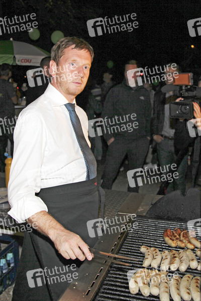 Politiker, CDU, Ministerpräsident von Sachsen, Politik, Wahl, Wahlkampf, Partei, Wahlkampfveranstaltung, Parteienwerbung, Kandidat, Kampagne, Wahlen, Bratwurst grillen