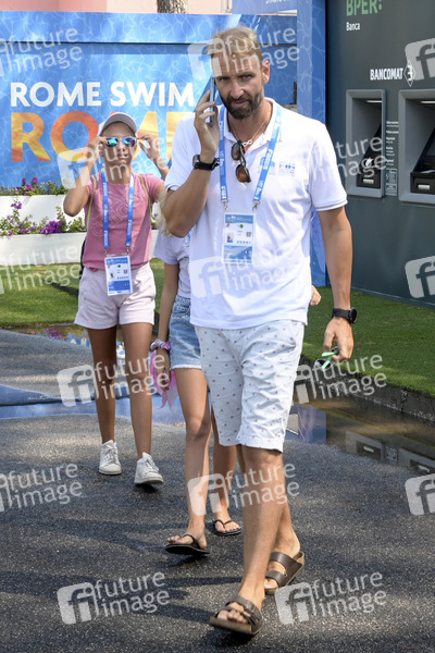 Massimiliano Rosolino mit Töchtern Sofia Nicole und VIttoria Sidney bei der European Aquatics Championship 2022 im Foro Italico. Rom, 13.08.2022