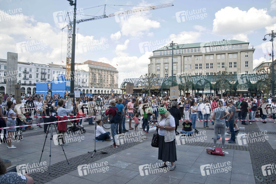 Demonstranten auf der Demo gegen die Einschränkung der Grundrechte wegen der Covid-19 Pandemie vor dem Hamburger Rathaus. Hamburg, 09.05.2020
