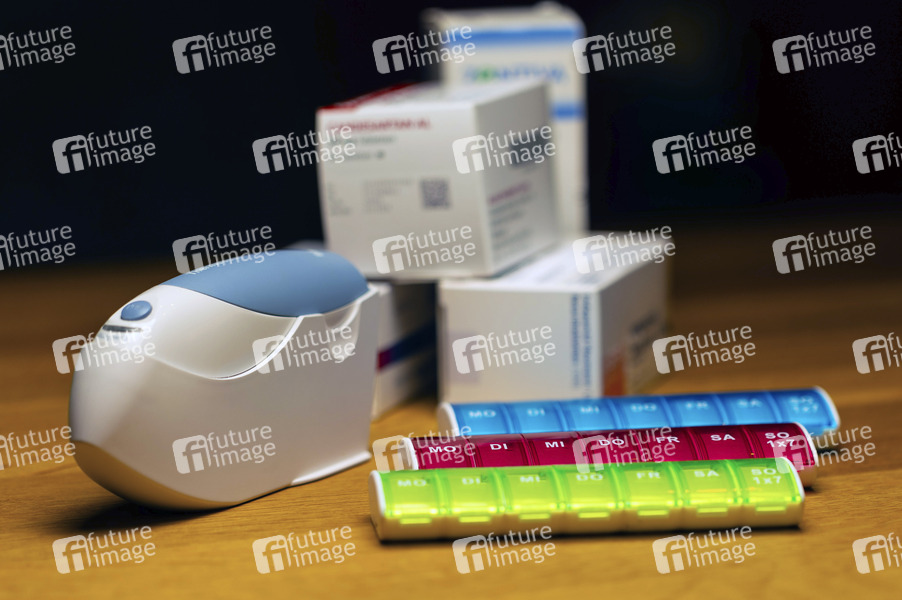 Medikamentendispenser, Tablettendose, Tablettenbox, Tablettendispenser, Medikamentenspender, Medikamentenbox, Arzneikassette, Pillendose, Pilmate, Medikamentendosierbehälter, Medikamentenschieber, Medizin, Arzneimittel, Arznei, Talbette, Tabletten, Pille, Pillen, Einnahme, Medikamente, Pharmazie, Krankheit, Arzneimittelgesetz, Medikation, Symbolbild, Themenbild