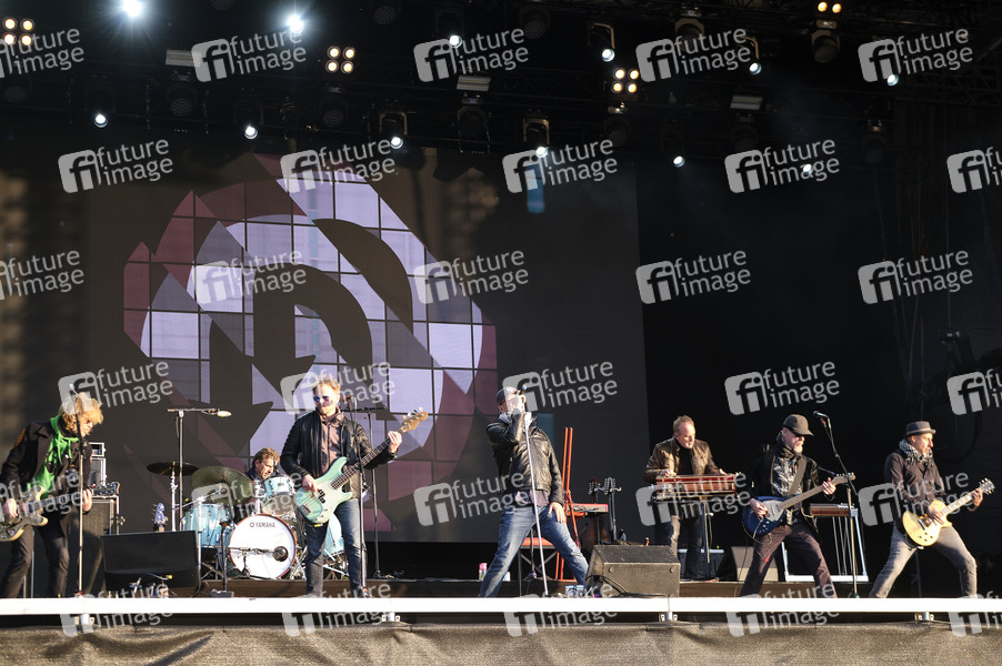 Christof Stein-Schneider, Rainer Schumann, Christian Decker, Kai Wingenfelder, Martin Huch, Gero Drnek und Thorsten Wingenfelder von Fury in the Slaughterhouse live beim Autokultur-Konzert auf dem Schützenplatz. Die Besucher verfolgen unter Berücksichtigung klarer Hygiene-Vorschriften während der Corona-Krise den Auftritt aus dem Auto. Hannover, 14.05.2020