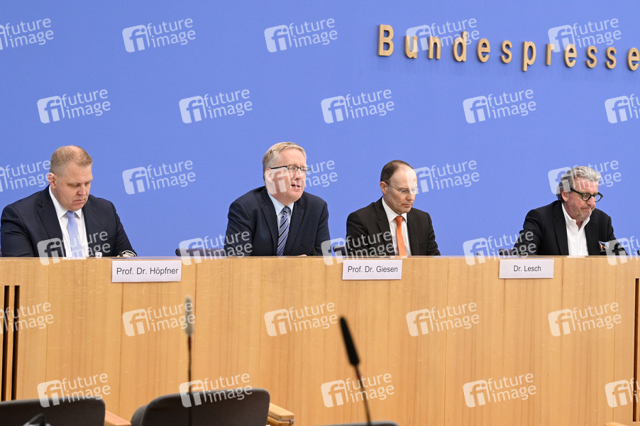Clemens Höpfner, Richard Giesen, Hagen Lesch und Stefan Wolf bei der Bundespressekonferenz Entwurf eines Gesetzes zur Schlichtung von Tarifkonflikten im Haus der Bundespressekonferenz. Berlin, 26.03.2025