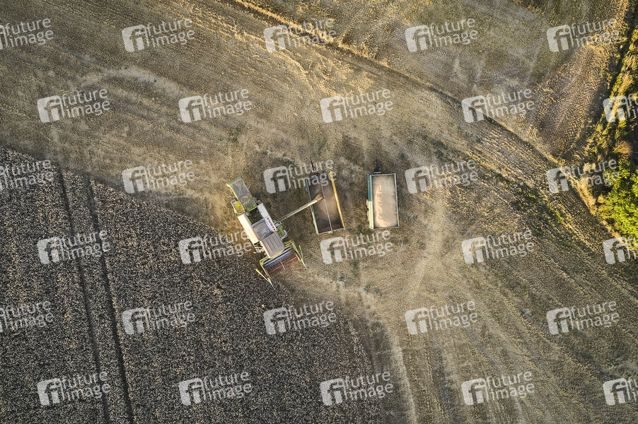 Luftbild, Luftaufnahme, Mähdrescher, Erntemaschine, Korn, Kornfeld, Vollkorn, Ähren, Halme, Feld, Landwirtschaft, Dürre, Trockenheit, Wasser, Regen, Grundwasser, Wasserknappheit, Grundwasserspiegel, Grundwasserpegel, Trockenphase, Ernte, Ernten, Getreide, Landwirte, Bauern, Acker, Äcker, Weizen, Gerste, Roggen, Wheat, Rye, Barley, Körner, Triticale, Anbau, Bio, Dünger, Agrar, Agrarwirtschaft, Erntewetter, Ernteausfall, Ernteausfälle, Futterkrise, Missernte, Futter, Saat, Saatgut, Anbau, Fruchtbarkeit, Bauern, Bauernverband, Symbolbild, Symbolfoto
