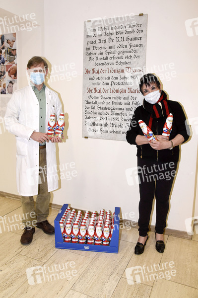Prof. Dr. Christoph Klein und Uschi Ackermann bei der Übergabe der gespendeten 700 Schokoladennikoläuse an das Dr. von Haunersche Kinderspital. München, 16.12.2020