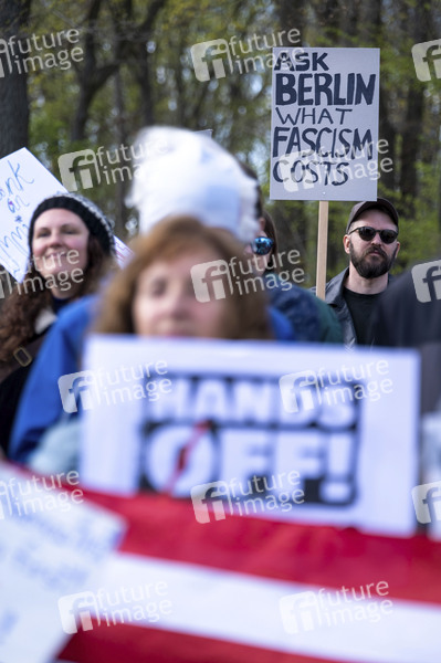 Amerikanische Staatsbürger, unter anderen von Democrats Abroad, protestieren unter dem Motto 'Hands Off' vor der US-Botschaft in Berlin gegen die Politik von Donald Trump und Elon Musk in den USA. Berlin, 05.04.2025