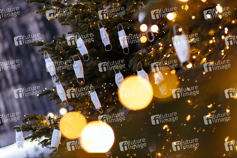 Gesichtsmasken hängen an den Weihnachtsbäumen auf dem Roncalliplatz. Normalerweise wird der Platz als Standort für einen der umsatzstärksten Weihnachtsmärkte der Region genutzt. Aufgrund der Corona-Pandemie wurde dieser ersatzlos gestrichen. (Themenbild, Symbolbild) Köln, 11.12.2020