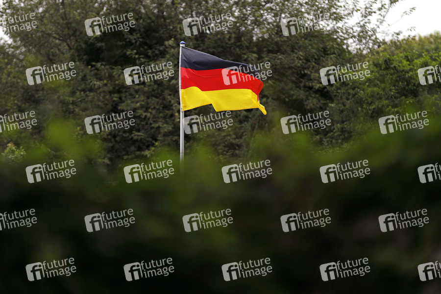 Eine Deutschlandfahne weht in einer Kleingartenanlage in Bonn. Viele Kleingärtner hissen gerne Fahnen in ihrer Parzelle. (Themenbild, Symbolbild) Bonn, 05.07.2021