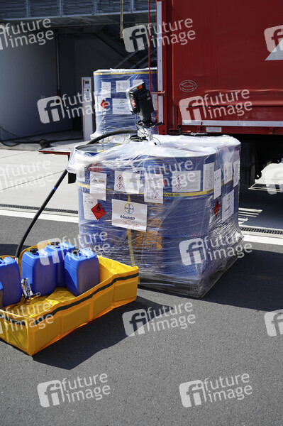 Die Firma Bayer spendet Desinfektionsmittel an die Stadt Köln. Hier bei der Übergabe in der Feuerwehrwache Köln-Kalk. Köln, 07.04.2020