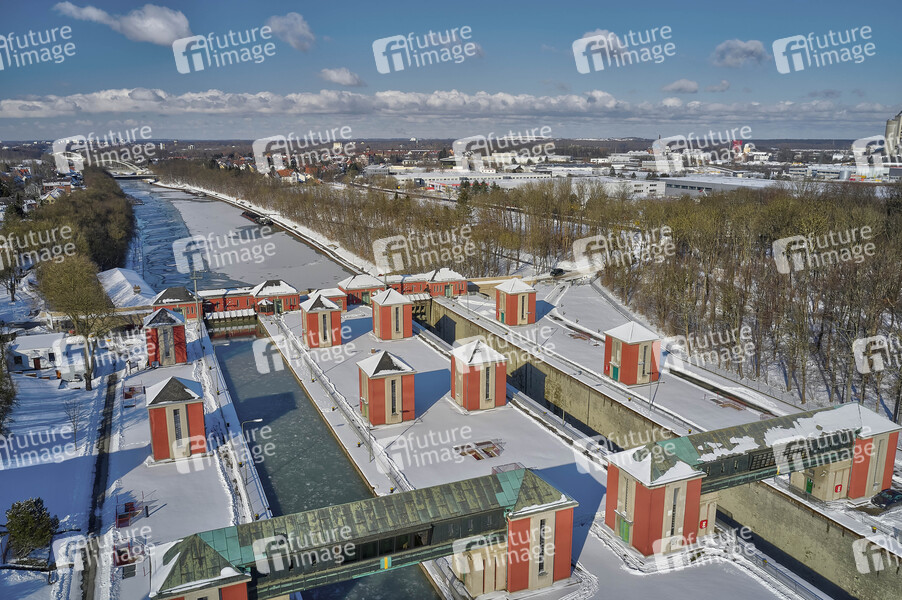 Schleuse Anderten, Wetter, verschneit, Schnee, Glätte, Eis, kalt, Wintereinbruch, Minustemperaturen, Winter, Winterwetter, Grenzwetterlage, Schneefälle, Schneefall, Frost, Wetterlage, Schiffahrt, Binnenschleuse, Kanal, Gewässer, Eisschollen, Drohne, Drohnen, Kameradrohne, Drohnenaufnahme