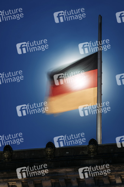 Reichstagsgebäude, Reichstag, Deutschlandfahne, schwatz-rot-gold, Fahne, Flagge, Bundestag, Mond, Gedenktag, Gedenken, Abendstimmung, Blaue Stunde, Trauerbeflaggung, Halbmast, Trauer, Gedenken, Erinnerung, wird vom Innenministern des Bundes oder Länder angeordnet, Symbolfoto, Symbolbild