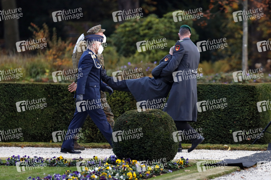 Während der Rede von Ministerpräsident Hendrik Wüst anlässlich des 66. Gründungs-jahres der Bundeswehr zum feierlichen Gelöbnis vor der Villa Hammerschmidt in Bonn bricht ein Rekrut mit Kreislaufproblemen zusammen. 50 Soldatinnen und Soldaten des ABC-Abwehrbataillons 7 aus Höxter und des ABC-Abwehrbataillons 750 aus Bruchsal legen hier ihr Gelöbnis ab. Bonn, 12.11.2021