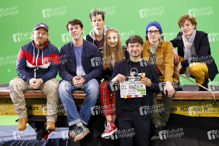 Axel Stein, Oskar Keymer, Eloi Christ, Lina Hüesker, Regisseur Granz Henman, Maximilian Ehrenreich und Georg Sulzer beim Fototermin am Set des Kinofilms 'Hilfe, ich hab meine Freunde geschrumpft' in den MMC-Studios in Ossendorf. Köln, 01.10.2019