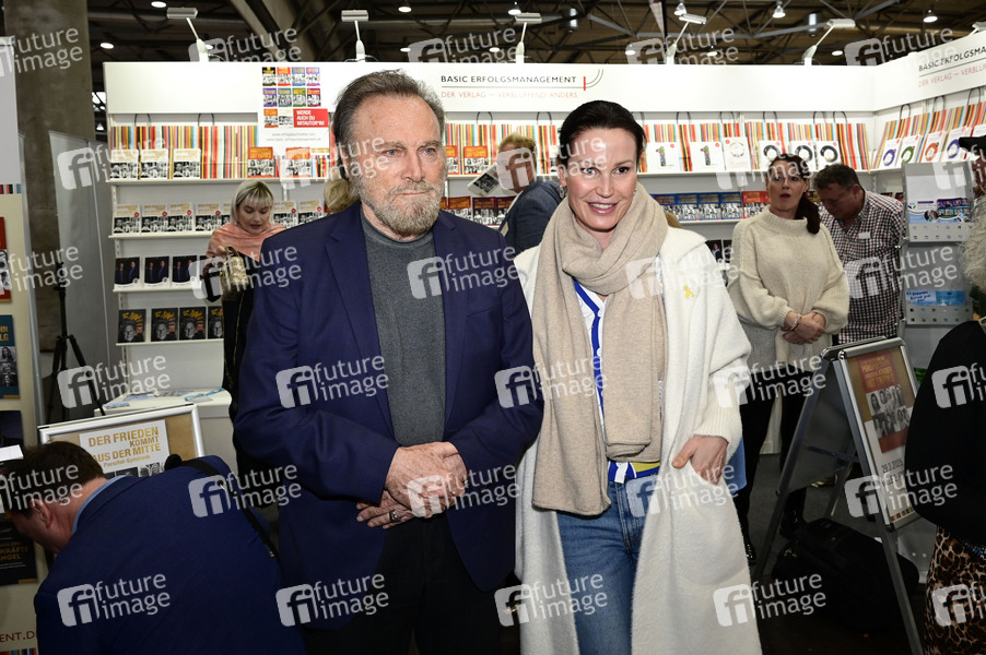 Franco Nero und Katharina Gerhardt beim Sektempfang zur Lesung 'Der Frieden kommt aus der Mitte' am Messestand des Verlages Basic Erfolgsmanagement in der Halle 2 auf der Leipziger Buchmesse 2025 auf dem Messegelände. Leipzig, 29.03.2025