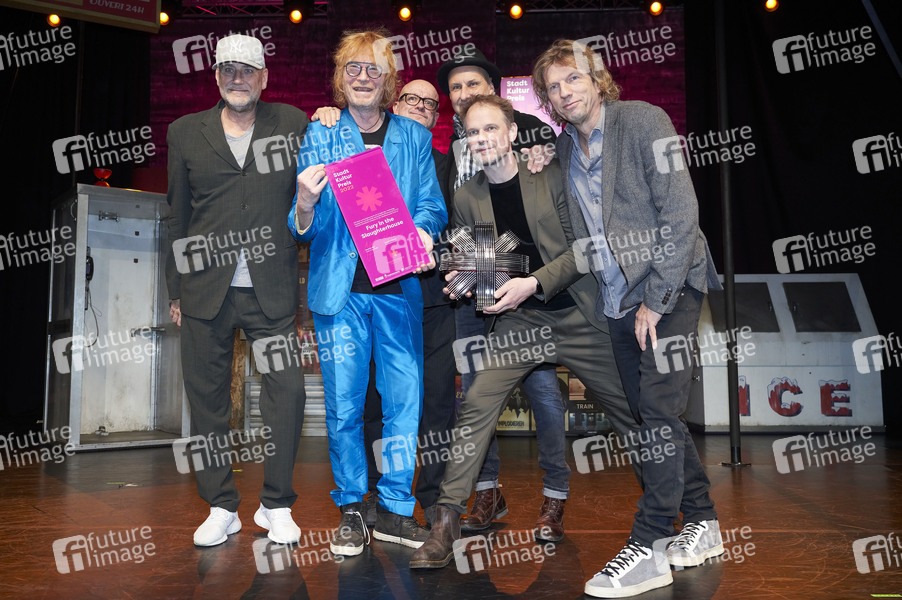 Kai Wingenfelder, Christof Stein-Schneider, Gero Drnek, Thorsten Wingenfelder, Christian Decker und Rainer Schumann bei der Verleihung des Stadtkulturpreises 2022 durch den Freundeskreis Hannover an Fury in the Slaughterhouse in der Orangerie Herrenhausen. Hannover, 29.12.2022