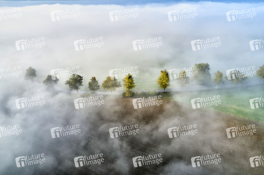 Morgennebel, Nebel, Hochnebel, vernebelt, Sichtweite, Wettervorhersage, eingeschränkte Sicht, diesig, schlechte Sicht, Sichtbehinderung, Wetter, Verkehr, Unfallgefahr, Kondensation, Luftaufnahme, Luftbild, Drohne, Drohnenaufnahme, Symbolbild, Symbolfoto