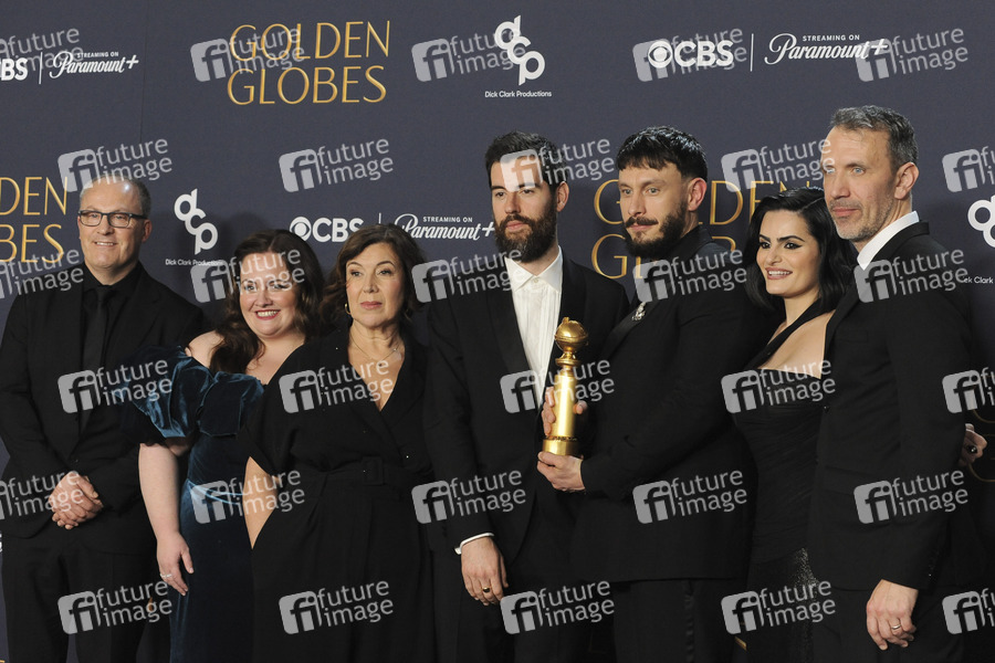 Wim De Greef, Jessica Gunning, Petra Fried, Ed Macdonald, Richard Gadd, Nava Mau und Matt Jarvis mit dem Preis für die beste Miniserie 'Rentierbaby / Baby Reindeer' bei der Verleihung der 82. Golden Globe Awards 2025 im Beverly Hilton Hotel. Beverly Hills, 05.01.2025