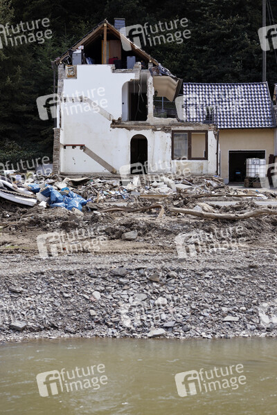 Nach dem Jahrhunderthochwasser in der Eifel durch heftige Regenfälle und Dauerregen mit Überschwemmungen und Überflutungen haben die Aufräumarbeiten im Ahrtal große Fortschritte gemacht. Einheiten von Polizei, THW, Bundeswehr und Feuerwehr mitsamt vielen freiwilligen Helfern haben Straßen geräumt, Schutt und Schlamm entfernt und die Menschen versorgt. Der Wiederaufbau wird trotzdem Jahre dauern. Im Bild Flutschäden in der Ortschaft Dernau, in der die Flut viele Häuser zerstörte, 30.07.2021
