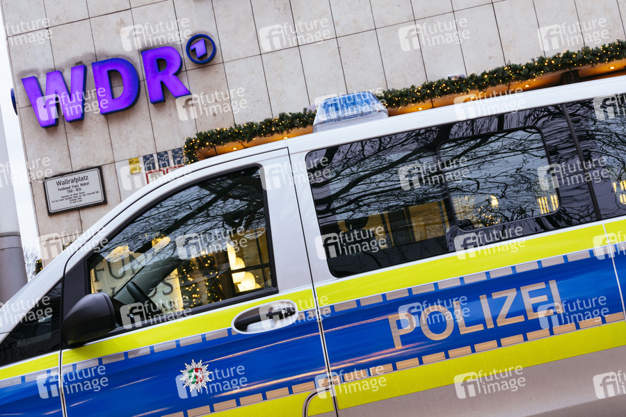 Polizeiauto vor dem WDR-Funkhaus am Wallrafplatz, wo am Montag Rechte aufs Dach kletterten und ein Transparent gegen die GEZ entrollten. Köln, 05.01.2020