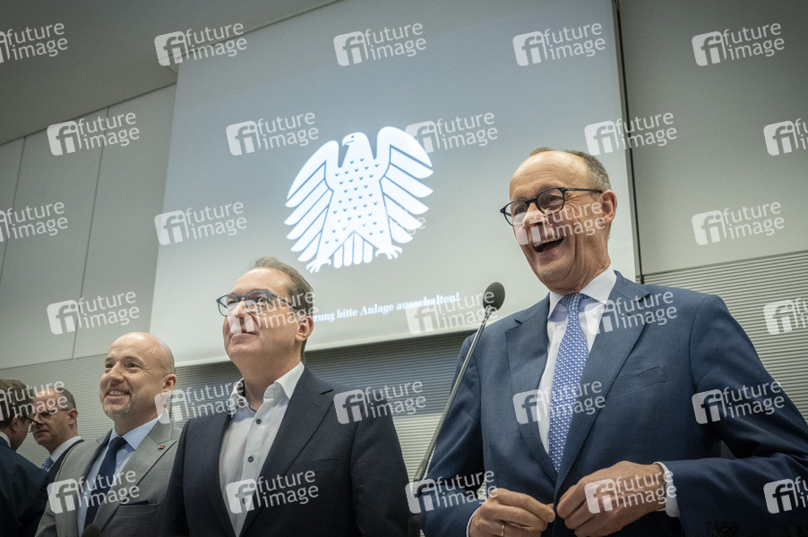 Alexander Hoffmann, Alexander Dobrindt und Friedrich Merz in der Fraktionssitzung der CDU/CSU-Bundestagsfraktion im Reichstagsgebäude. Berlin, 10.02.2025