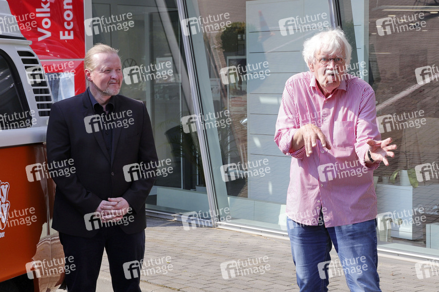 Joey Kelly und Carlo von Tiedemann beim Fototermin zum Start der Reise von Joey Kelly, der mit seinem Sohn Luke das grüne Band der alten innerdeutschen Grenze besucht im alten T2 von 1979, am Elbtor Griegstrasse. Hamburg, 13.08.2020